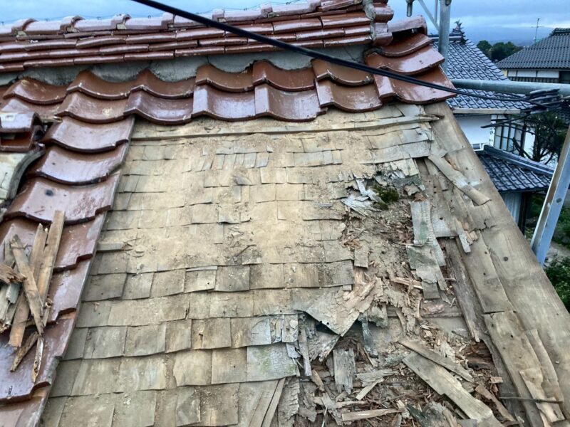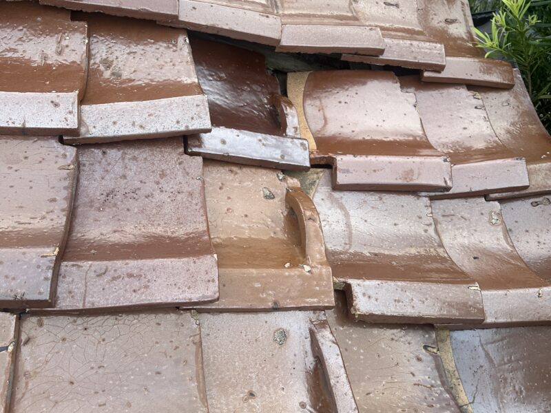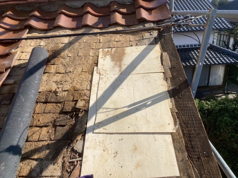 ズレた瓦をどけた状態です。屋根地が傷んでボロボロの状態になってしまっています。