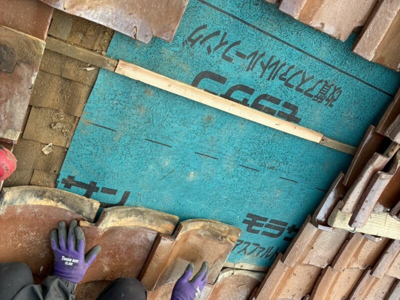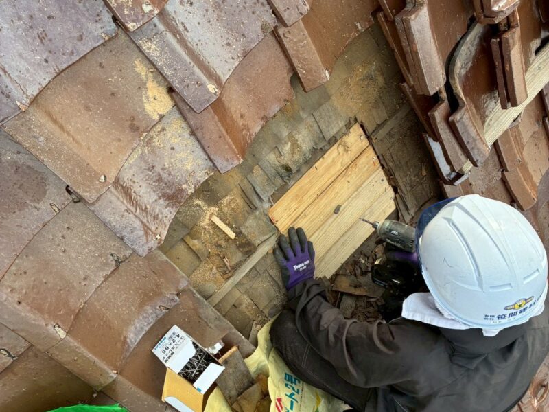 こちらも、先程同様ルーフィングで雨水が、屋根の下に漏れないようにします。瓦桟木もしっかり補修します。