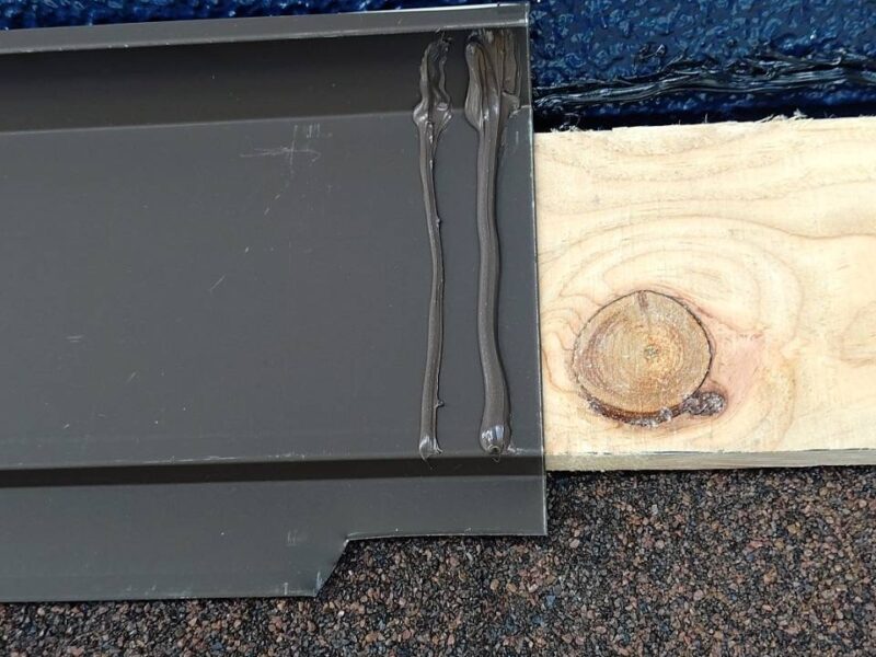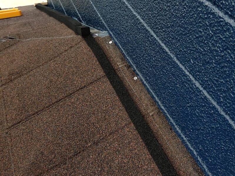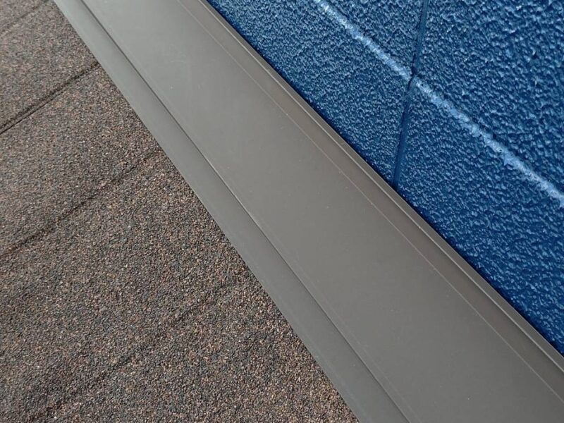 取り合い水切りを取り付け、最後に外壁と取り合い水切りの間にコーキングを打って壁と下屋根の境目をしっかり保護しました。