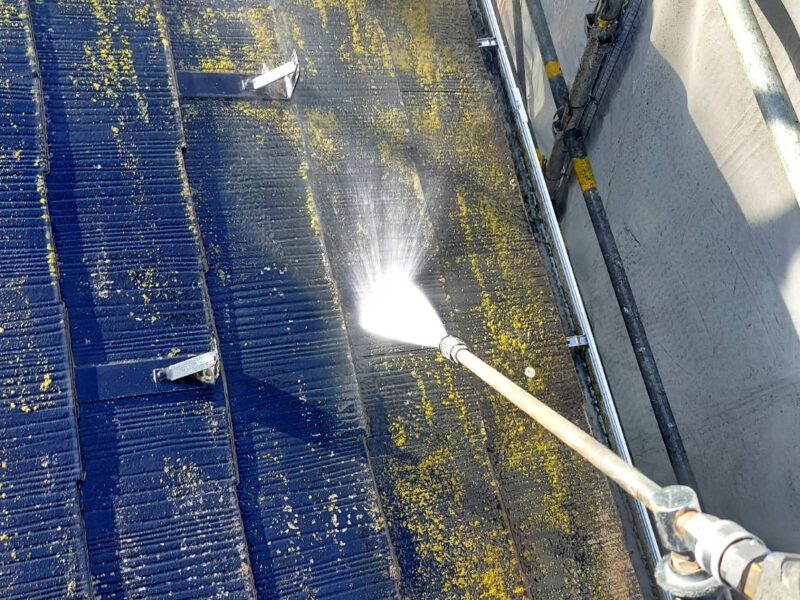 屋根カバー工法の前に、高圧洗浄機を使用して屋根表面の汚れや劣化した塗膜を洗浄します。